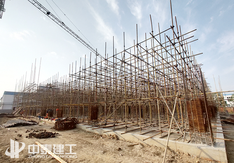 項(xiàng)目于2020年7月25日開工,經(jīng)過前期的不懈努力,在烈日炎炎的環(huán)境下,順利完成場地平整、土方開挖、基礎(chǔ)施工。2020年9、10月間,面對首層層高7.5米和二層層高超過8米的不利條件下,中泰建工嚴(yán)格按照經(jīng)專家論證通過的高大支模方案進(jìn)行模板施工,認(rèn)真檢查支撐體系。確保達(dá)到施工的安全情況下,順利完成模架支撐體系搭設(shè)。于2020年11月16日順利完成結(jié)構(gòu)封頂。