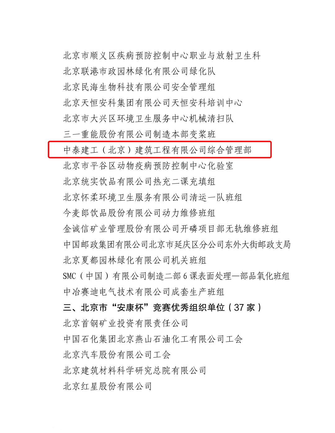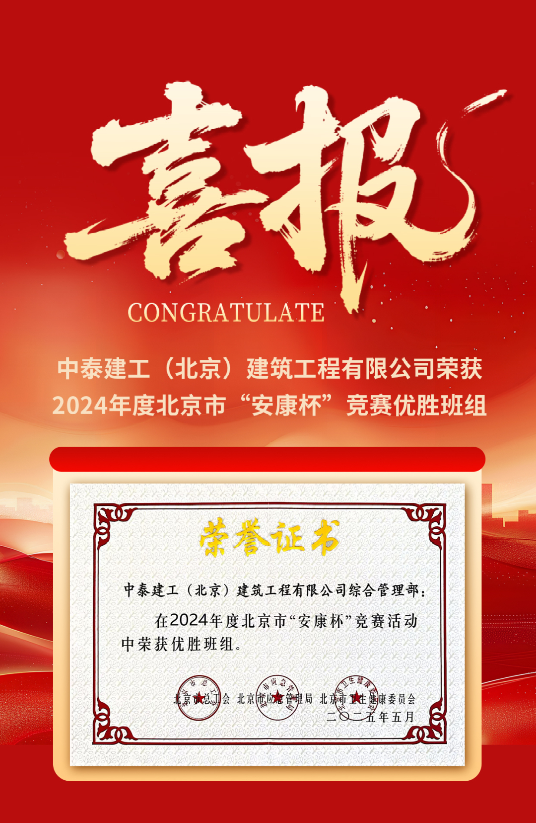 近日,北京市總工會、市應(yīng)急管理局、市衛(wèi)生健康委員會聯(lián)合公布北京市“安康杯”競賽活動結(jié)果的通報,中泰建工(北京)建筑工程有限公司綜合管理部榮獲2024年度北京市“安康杯”競賽優(yōu)勝班組,這不僅是對公司安全生產(chǎn)工作的高度認(rèn)可,更是對全體員工踐行安全理念、共筑安全防線的生動詮釋。